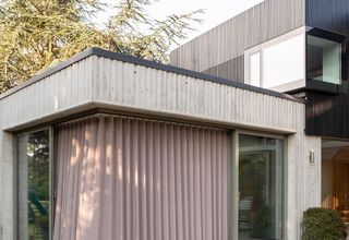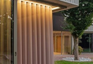 Il progetto finale ha incluso ampie vetrate a tutta altezza, rendendo necessarie soluzioni di schermatura. Le tende Wave si sono rivelate la scelta ideale: le loro linee pulite si armonizzano perfettamente con il rivestimento esterno in legno scanalato. Il tessuto Colorama 1, abbinato a un'illuminazione soffusa, dona calore e privacy nelle ore serali, mentre l'impacchettamento Wave garantisce la massima visuale durante il giorno.