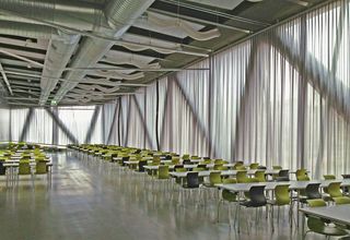 Per la schermatura interna e la protezione dall’abbagliamento sono stati installate tende arricciate motorizzate SG 5600, con estensioni fino a 16 metri, progettate per esaltare l’effetto scultoreo e sopraelevato della facciata esterna. Un elemento architettonico distintivo è il soffitto inclinato a 19 gradi sopra le aule, che impone ai binari motorizzati di sostenere costantemente la tensione generata dal peso delle tende.